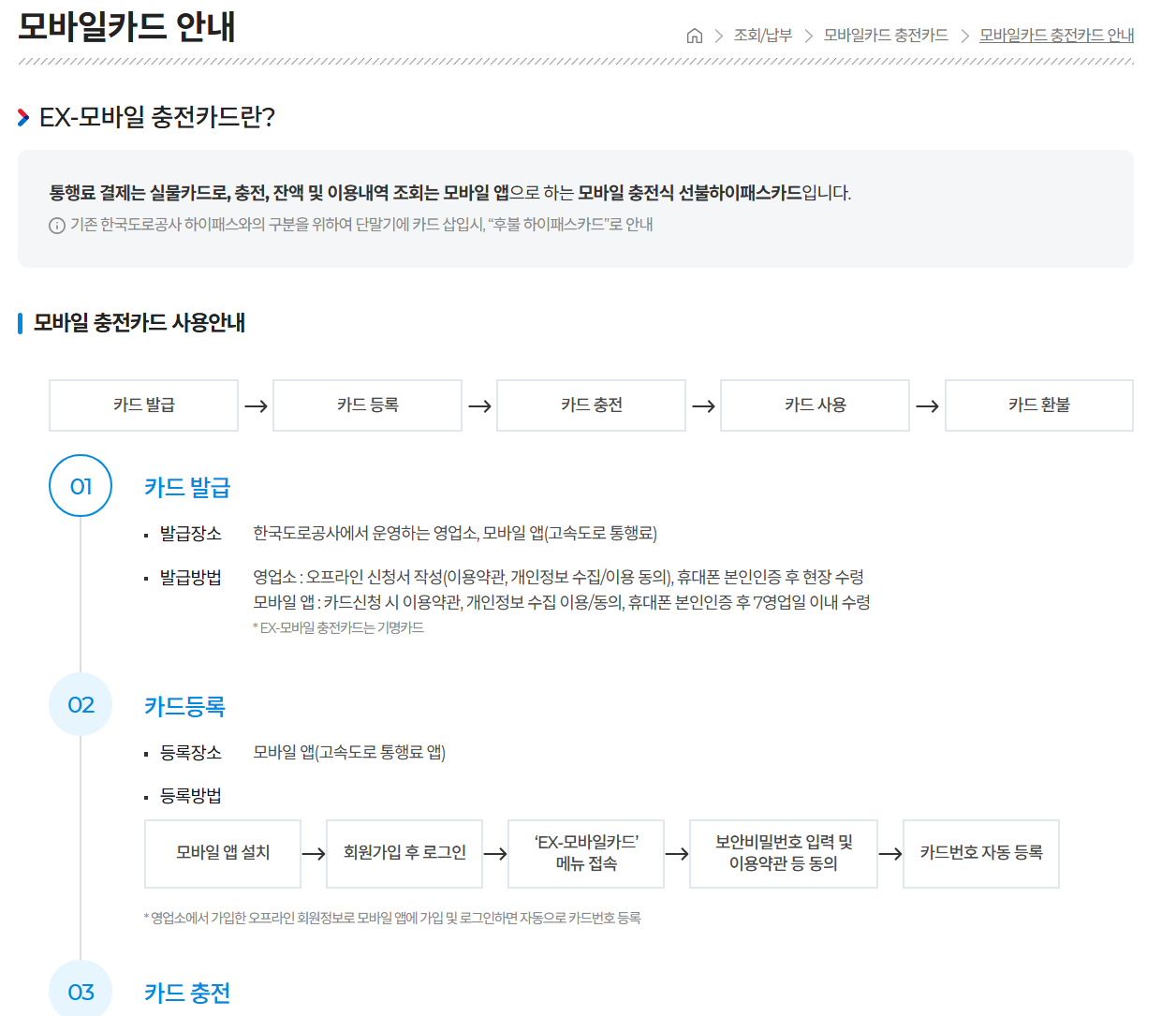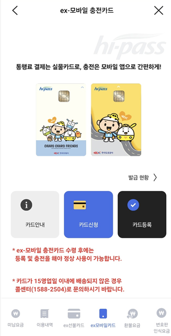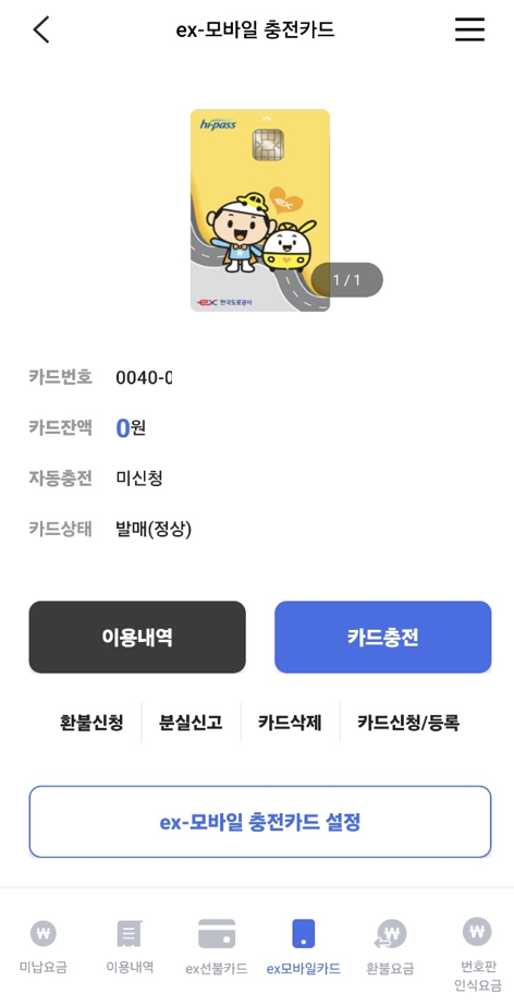 ex 모바일 충전카드는 통행료 결제는 실물카드로하고 충전/잔액 조회는 모바일 앱으로 하는 모바일 충전식 선불하이패스카드로 무엇보다 연회비가 무료입니다!!