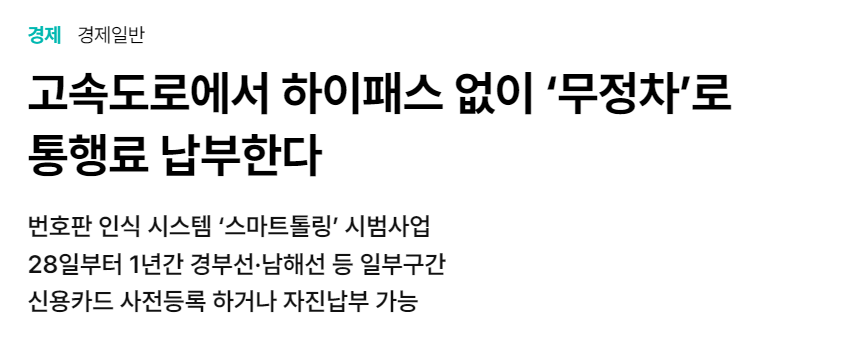 현재 국토부는 1년간 경부선의 양재~대왕판교 구간의 대왕판교영업소와 남해선의 영암~순천 구간의 서영암영업소 및 강진무위사·장흥·보성·벌교·고흥·남순천·순천만영업소 등 8곳에서 무정차 통행료 결제 시범사업을 진행할 예정이라고 합니다.