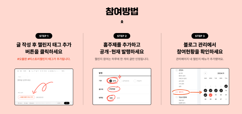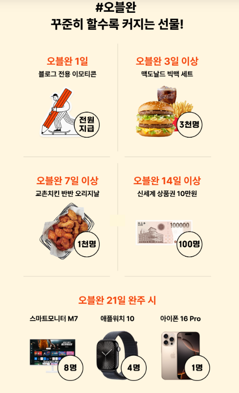 참여할 수록 경품이 커져서 참여자 전원에게 티스토리 블로그 전용 이모티콘을 지급하고, 참여 일수에 따라 추첨을 통해 선물도 증정할 예정일라고 합니다. 3일, 7일, 14일 이상 참여하면 각각 맥도날드 빅맥 교환권(3000명), 교촌치킨 교환권(1000명), 신세계 상품권(100명)을, 3주간 매일 참여 시 스마트 모니터(8명)와 애플워치 10(4명), 아이폰 16 pro(1명)를 추첨해 선물할 예정이라고 합니다.