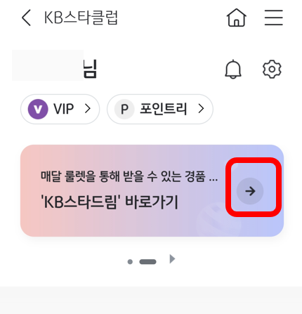 KB 스타클럽에 들어가셔서 상단의 배너를 오른쪽으로 한번 이동하면 매달 룰렛을 통해 받을 수 있는 경품 KB스타드림 바로가기가 있습니다. 해당 메뉴를 통해서 룰렛 게임을 진행할 수 있습니다.