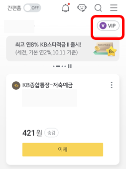 KB스타뱅킹 앱의 메인 화면에서 상단의 본인 등급, 아래 사진에서는 VIP를 클릭합니다. 그러면  KB스타클럽 메뉴에 들어가게 됩니다. 해당 메뉴는 KB의 회원 등급에 따른 혜택을 보여주는 페이지 인데요.