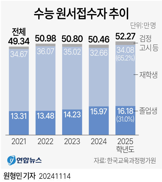 재학생이 전년 대비 1만4천131명 증가한 34만777명(65.2%), 졸업생은 16만1천784명(31.0%)으로 2천42명이 늘었습니다. 검정고시 등 기타 지원자는 1천909명 증가한 2만109명(3.8%)이라고 합니다.