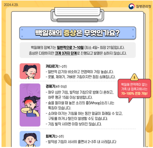 1단계 '카타르기'(1∼2주)엔 콧물, 재채기, 가벼운 기침이 점점 심해지는데요. 일반적 감기와 비슷하지만, 전염력이 가장 높은 시기입니다.. 2단계 '경해기'(4주 이상)엔 매우 심한 발작성 기침이 하루 평균 15회 이상 나타나게 됩니다. 밤에 더 흔하게 발생한다고 합니다. 이 때 숨을 들이쉴 때 특유의 '훕' 소리가 나게 됩니다. 소아와 아기는 기침하는 동안 얼굴이 파래지거나 구토하기도 합니다. 마지막 회복기(2∼3주)엔 발작성 기침이 서서히 줄어든다고 하네요. 증상 전 기간에 발열은 심하지 않습니다.
