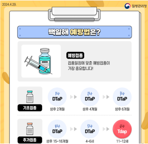 소아는 생후 2, 4, 6개월과 15∼18개월, 4∼6세에 DTaP(디프테리아·파상풍·백일해) 백신으로 접종하고,