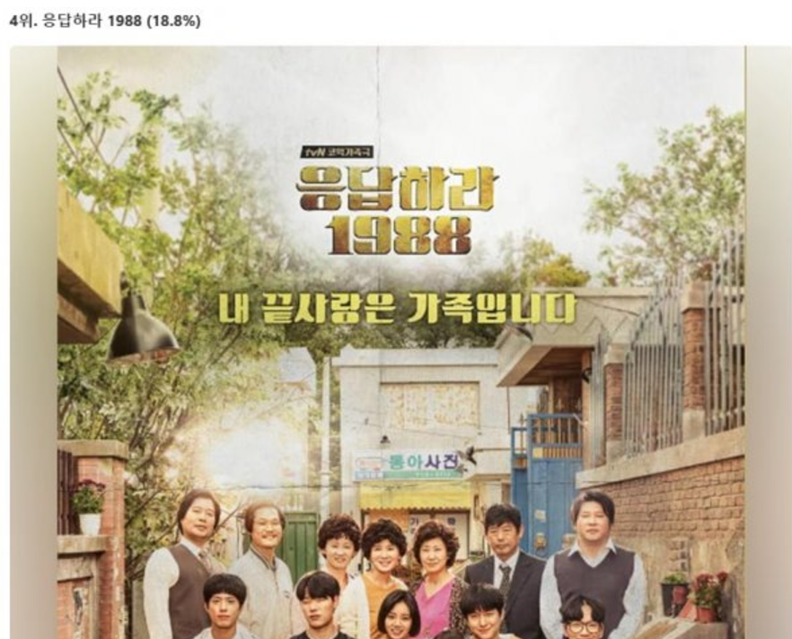 4위는 역시 응답하라 시리즈입니다. TvN을 일으킨 시리즈죠 응팔이 18.8%의 시청률을 보였습니다.