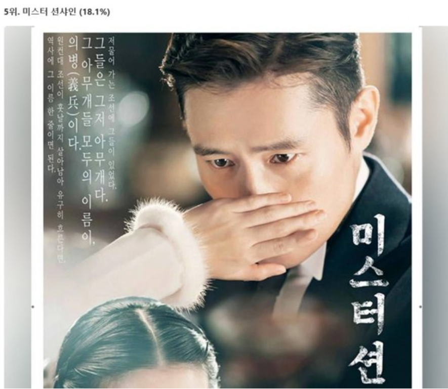 5위에 김태리가 또나옵니다. 김태리 이병현 주연의 미스터 션샤인입니다.
