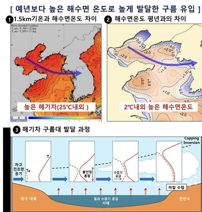 이 찬 바람이 서해를 지날 때 바람과 해수면의 기온 차인 ‘해기차’로 눈이 내리는데, 해기차가 클수록 대기로 방출되는 수증기량이 많아져 많은 눈이 오게 됩니다. “보통 바다와 바람의 온도가 12∼15도 이상 차이 나면 눈이 내리는데, 현재 서해상 해수면 온도가 평년보다 2∼3도 높은 상황”이라고 이번 폭설의 배경을 설명하고 있습니다.