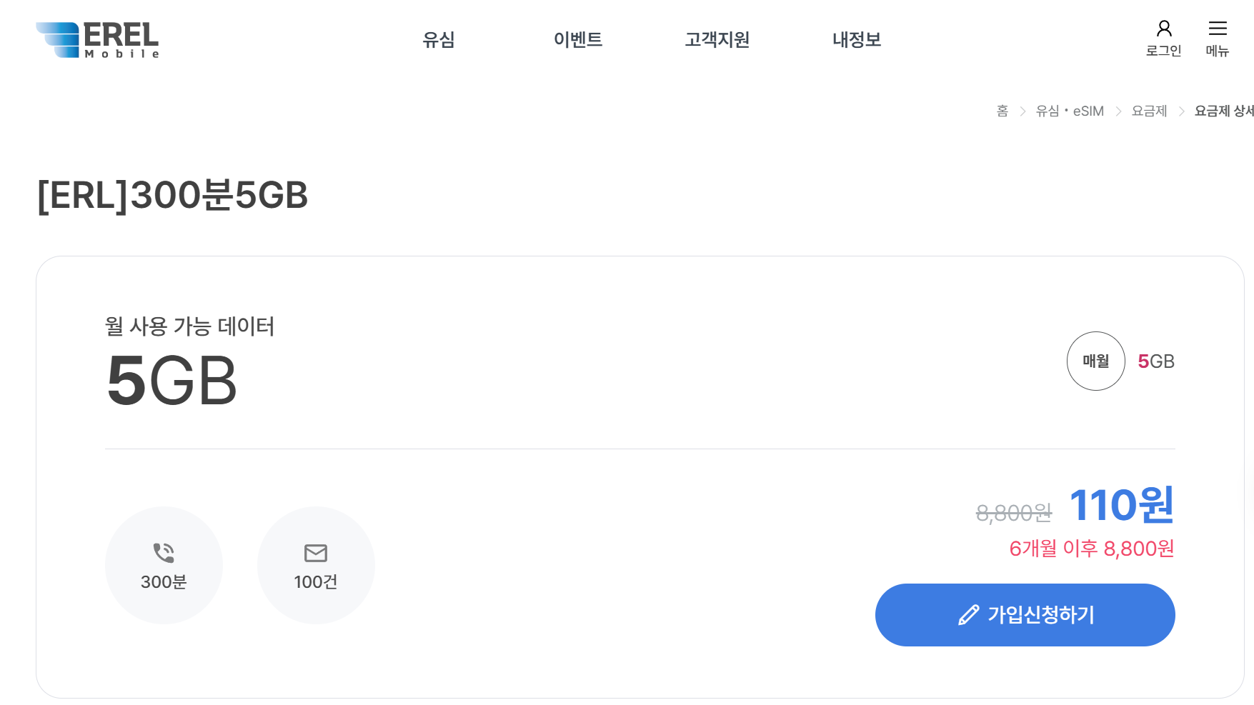 알뜰폰 서비스 업체중 하나인데요. 최근에 300분 5GB를 110원에 6개월간 서비스하고 있습니다.