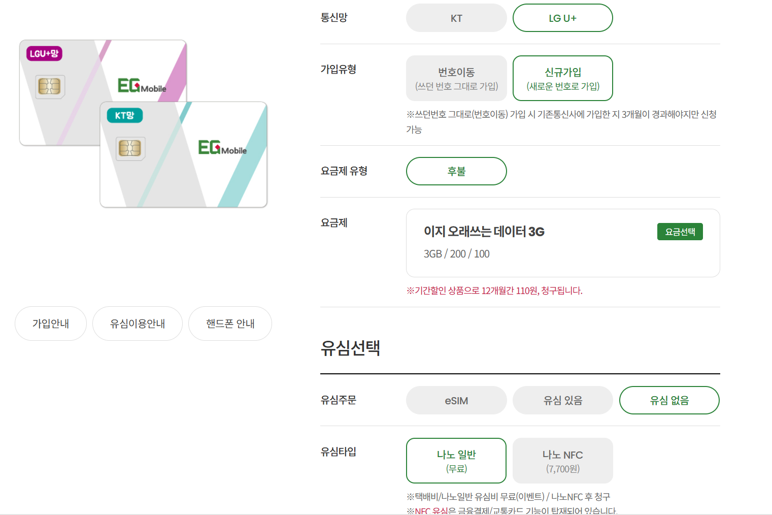 LGU+ 이지 오래쓰는 데이터 3G 12개월이후 평생 9,900원 데이터 용량 3GB 음성 용량 200 문자 용량 100 음성1.98원/초,영상3.3원/초,문자22원/건,데이터22.53원/MB 할인전 기본요금 월 9,900 원 할인 적용 기본