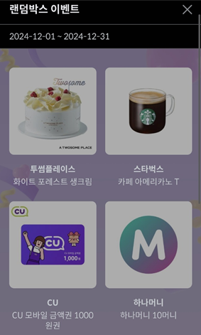 이벤트 참여하기를 누르면 기본 랜덤박스는 1원을 결제해서 투썸 화이트 포레스트 생크림, 스타벅스 아메리카노, cu 1000원권, 하나머니 10원이 나오는데요.