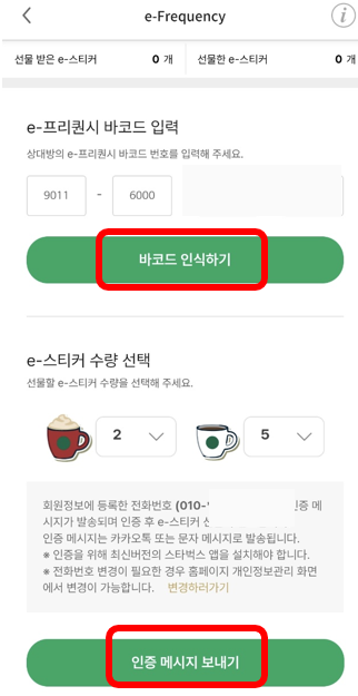 이제 프리퀀시 바코드를 입력해주고 선물하고자 하는 스티커를 선택해주면 됩니다.