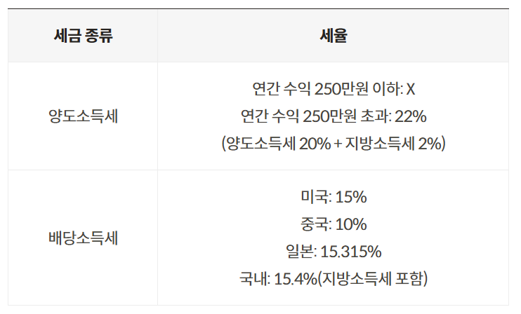- 해외에 내는 배당소득세: 배당소득세율은 나라마다 다릅니다. 미국은 15%, 중국은 10%, 일본은 15.315%, 홍콩은 0%입니다.