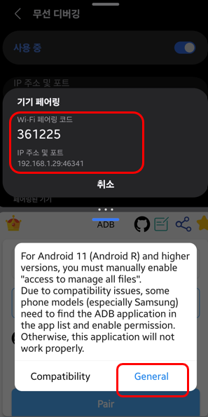 최초 안드로이드 권한 이슈가 나오면 general을 눌러서 권한을 허용해주는 과정이 1회 필요합니다.