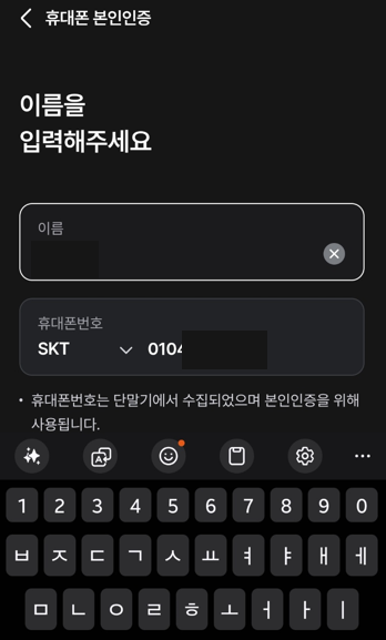 휴대폰 인증을 위해서 개인정보 활용에 동의하고 이름과 핸드폰 번호를 올바르게 입력해줍니다.