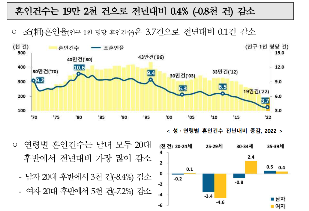 특히 연간 혼인율의 경우 천명당 3.7건에 불과합니다. 80년대에 10건에 비하면 70%이상 감소한 상황입니다.