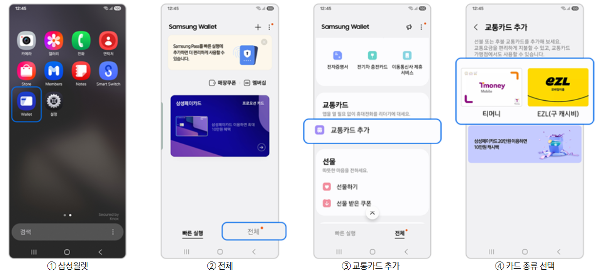 삼성 월렛(wallet)을 실행하고, 전체 메뉴에서 교통카드 - 교통카드 추가 메뉴로 들어갑니다.