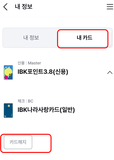 IBK카드의 해지는 카드앱에서 가능한데요.