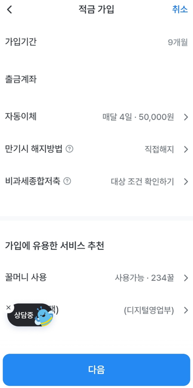 상담직원과 채팅 후 적금 가입시 5만원 이상