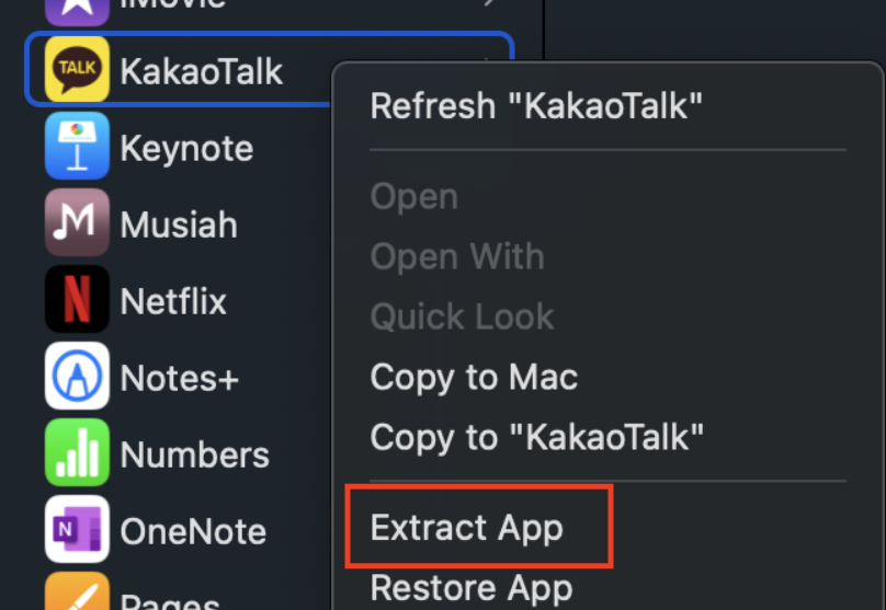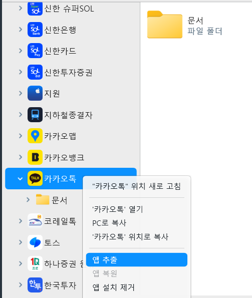 카카오톡에서 우클릭하여 앱 추출을 통해서 앱을 추출합니다.
