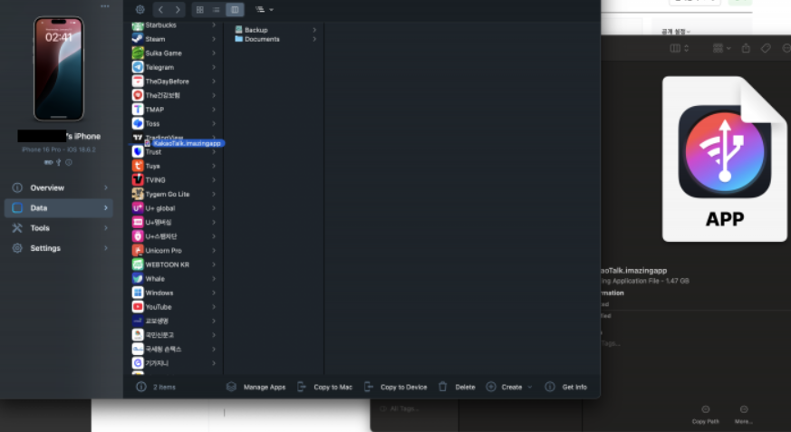 요즘에는 imazing이라는 앱으로 ipa 우회 설치를 한다고 합니다. 공홈에서 설치 파일을 다운로드 받고 이전버전이 설치된 아이폰에서 카카오톡을 가져옵니다.