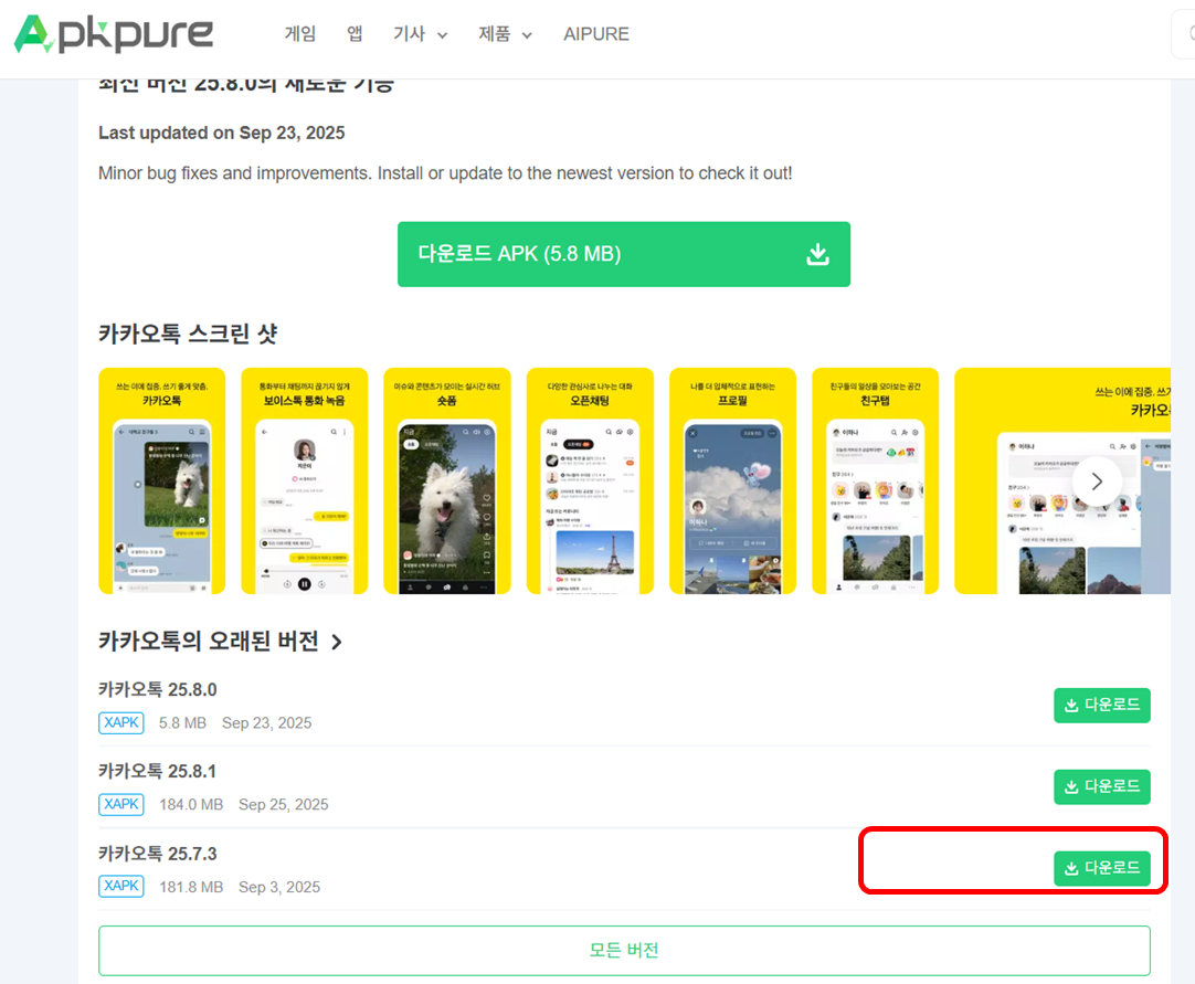 APK Pure의 경우 어느정도 공신력이 있기 때문에 믿고 다운로드 받으셔도 됩니다. 25.7.3버전이 업데이트 이전 버전이 해당 버전으로 다운로드 받으시면 됩니다.