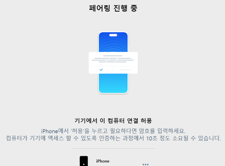 그리고 기기에서 이 컴퓨터 연결 허용 하셔야지 페어링이 됩니다.