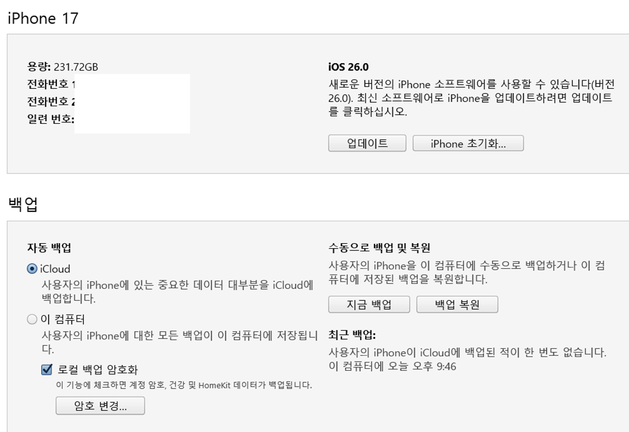 이 때에는 아이튠즈에서 백업을 해야하는데요. 컴퓨터에 아이튠즈를 설치하셔야 합니다.