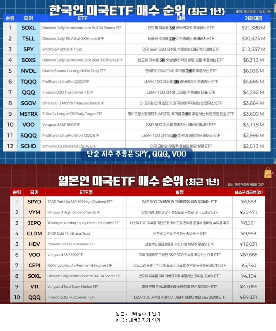 이번 데이터를 통해 한국과 일본 투자자들의 미국 ETF 투자 스타일이 극명하게 갈리는 것을 확인할 수 있었습니다.