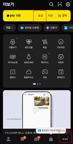 먼저 카카오톡에서 더보기 - 카카오페이 - 송금 메뉴로 들어갑니다.
