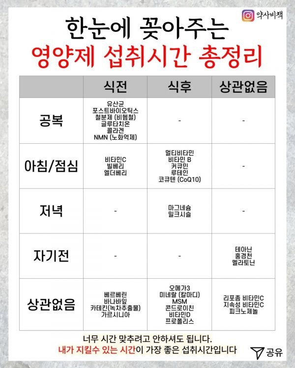아침 공복: 유산균, 비타민B군, 철분(위자극 없을 때)