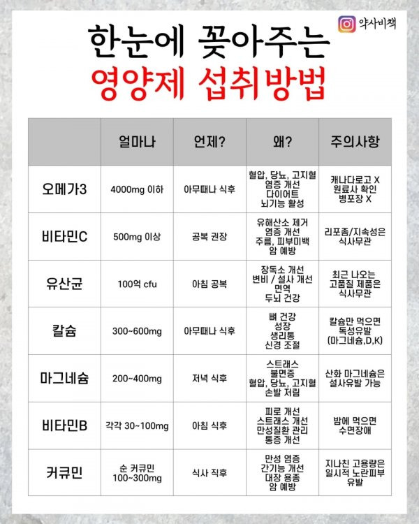 비타민C, 멀티비타민, 오메가3, 루테인, 마그네슘, 아연, 칼슘 등