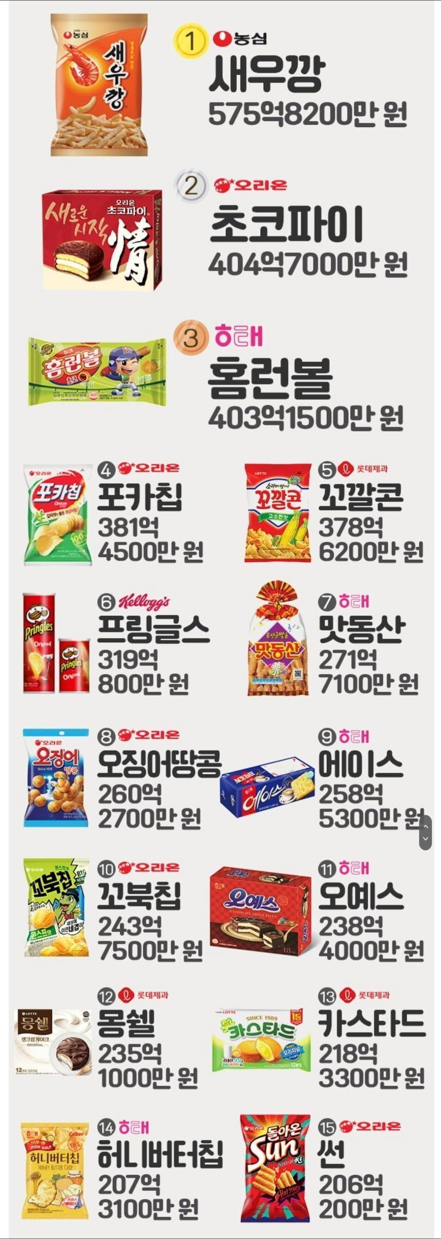 | 14 | 허니버터칩 | 해태 | 207억 3,100만 원 |