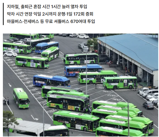지하철 연장 운행: * 출퇴근 시간대(07~10시) 1시간 연장 및 열차 추가 투입심야 운행 시간 다음날 오전 2시까지 연장 (총 172회 증회)
