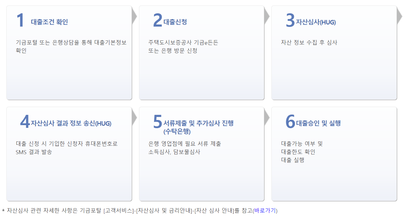 대출조건 확인 - 신청 - 자산심사 - 세류 제출 - 대출 승인의 절차로 진행됩니다.