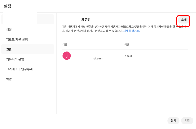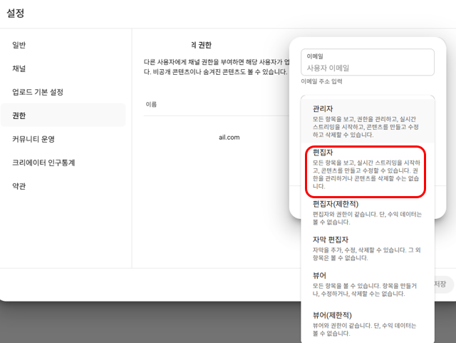 권한 메뉴에 가면 유튜브 스튜디오의 권한을 설정할 수 있습니다.