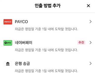 인출방법은 네이버페이/페이코/은행송금으로 송금받을 수 있습니다.