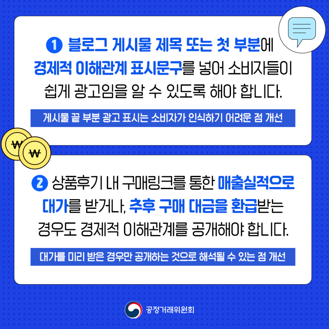 | 제목에 표시문구를 넣을 경우 생략되지 않도록 제목 길이를 적절하게 조절하고, 글 첫 부분에 넣을 경우 글자 크기나 색깔을 본문과 다르게 하도록 했다. 공정위는 경제적 대가를 미래·조건부로 받는 것 등 최근 유행하는 소셜미디어(SNS) 마케팅 유형도 광고·협찬 범주에 포함시켰다. 구매 링크를 통해 매출 실적에 따라 수수료를 받거나, 후기 작성 후 구매 대금을 환급받는 것 등이 여기에 해당합니다. |