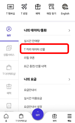 T월드 모바일 앱이나, 웹사이트에서 메뉴 -> 나의 데이터/통화 -> T끼리 데이터 선물 메뉴에 가시면 데이터 선물하기를 할 수 있는데요.