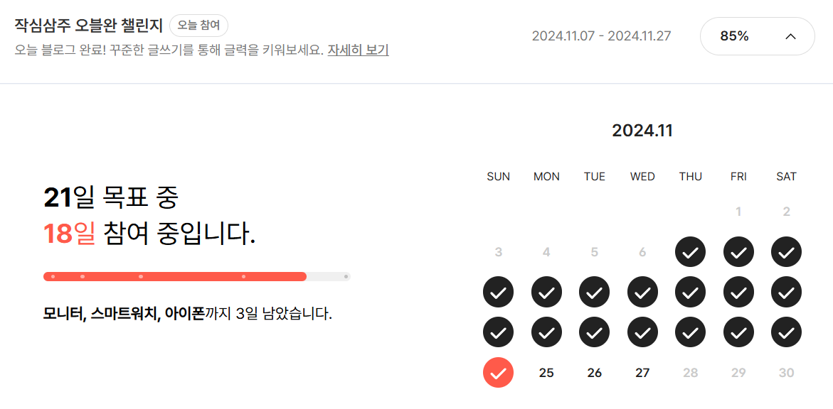 티스토리에서 이번에 새롭게 시작한 챌린지인데요. 21일간 하루도 빠짐없이 글을 쓰면 경품을 지급하는 챌린지 이벤트입니다. 지난 11월 5일부터 시작된 챌린지에 저도 18일째 참여중인데요. 벌서 85%를 달성했습니다.