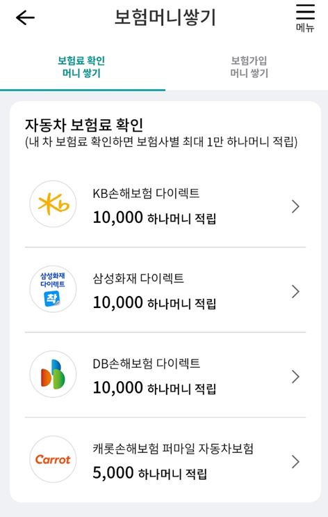 하나머니앱을 다운로드 받으시고, 하나머니 모으기 -> 보험머니쌓기 메뉴에 갑니다.