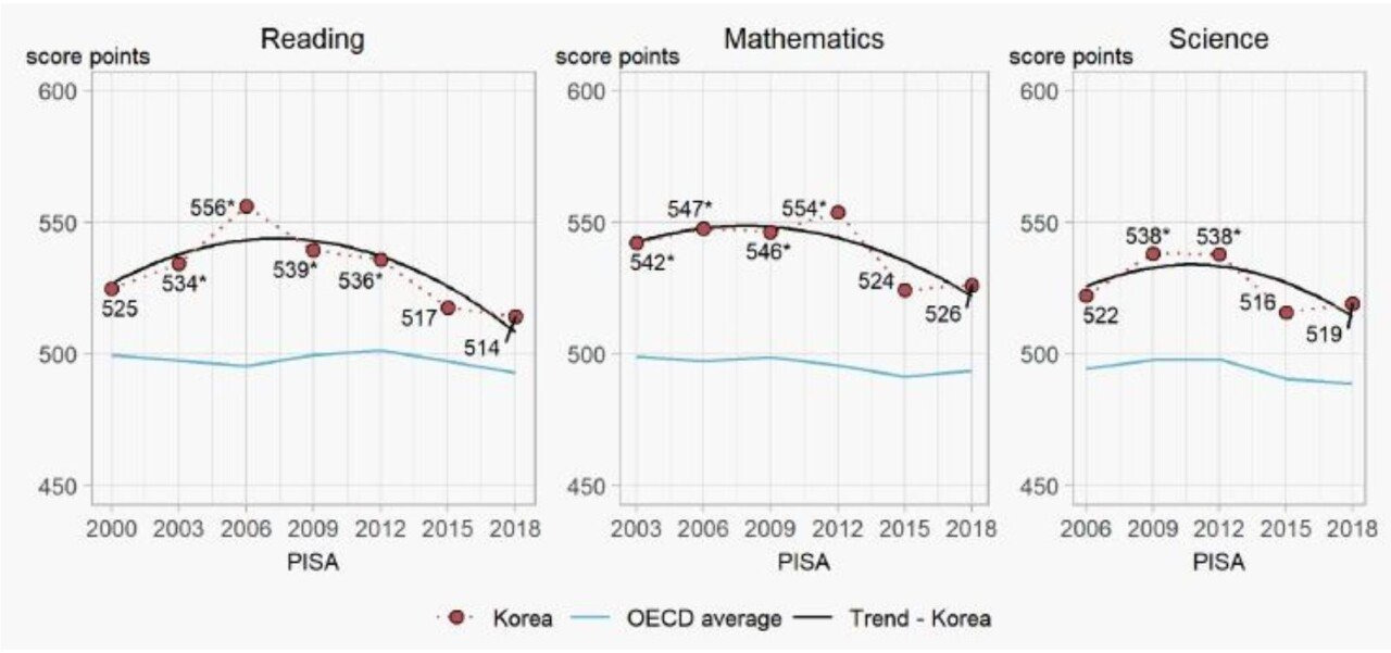 아래 그래프에서 보면 알겠지만 한국은 모든 영역에서 항상 OECD 평균 이상인 상황이지만 전체적으로 떨어져가는 수준입니다.