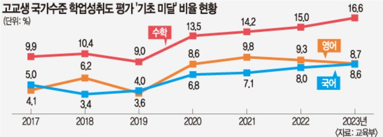 수학은 16%나 되고, 영어는 9%, 국어도 9%에 가까운 수준입니다.