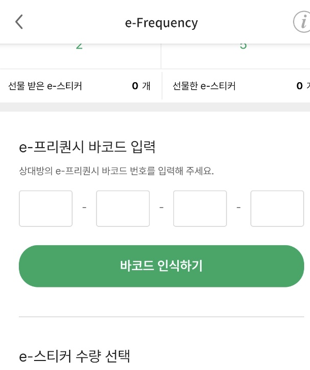 이제 프리퀀시 바코드를 입력해주고 선물하고자 하는 스티커를 선택해주면 됩니다.
