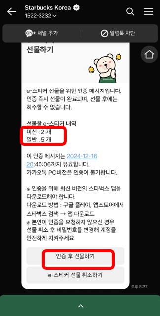 카카오톡을 통해 미션과 일반 선물 갯수가 맞는지 확인해보고,